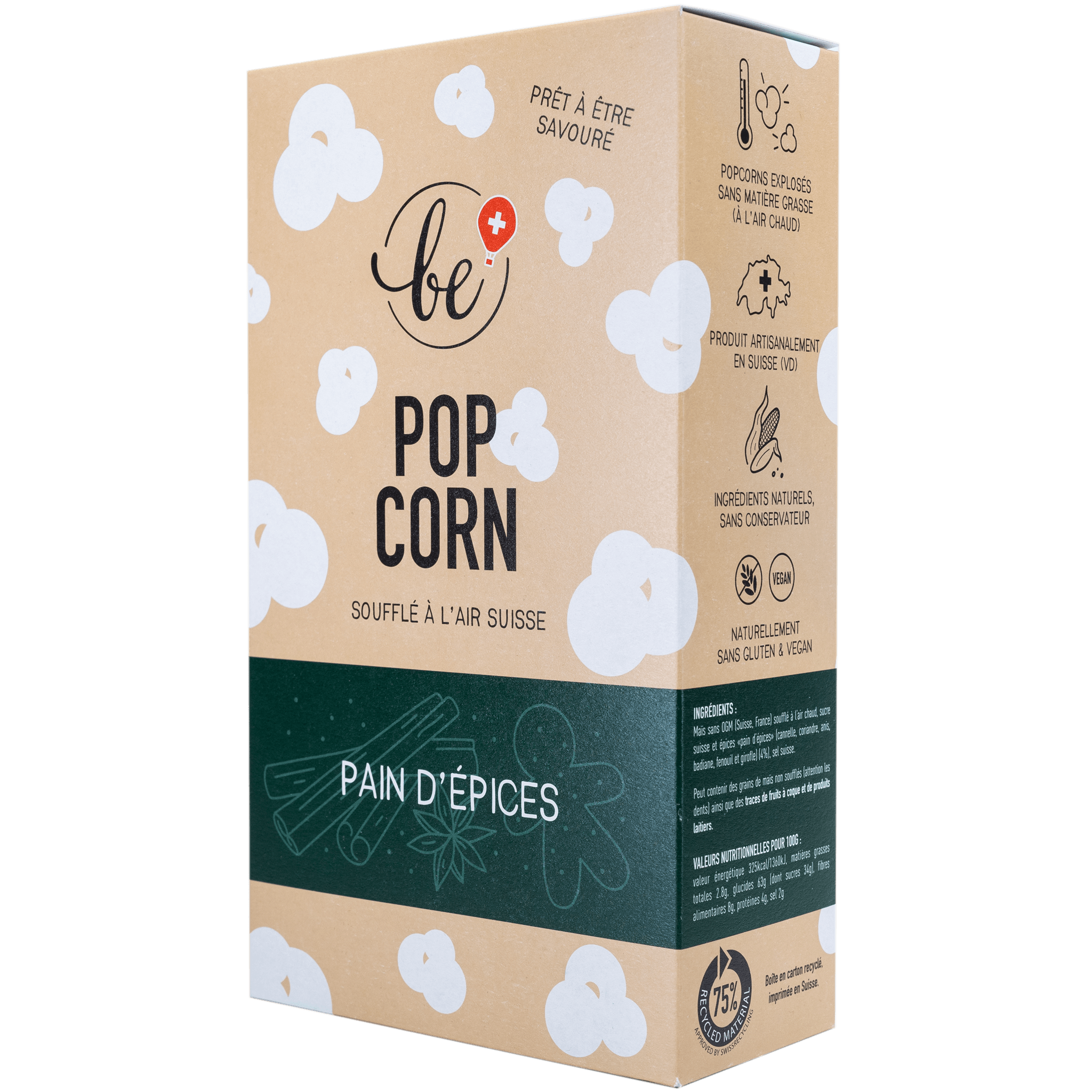 Ingrédients: Maïs IP-SUISSE soufflé à l’air chaud, sucre suisse et épices «pain d’épices» (cannelle, coriandre, anis, badiane, fenouil et girofle). Peut contenir des traces de fruits à coques